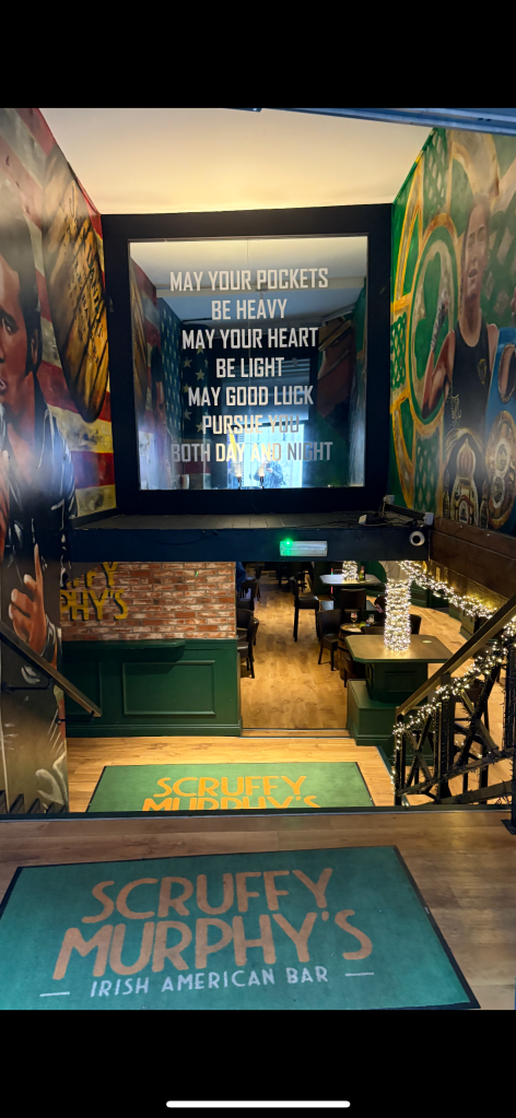 Reg popped in and took a picture of an Irish pub called Scruffy Murphy’s. I love the Irish blessing. May check it out on Tuesday night when we are staying in Liverpool.