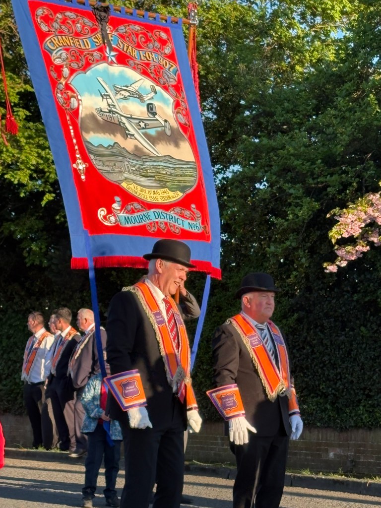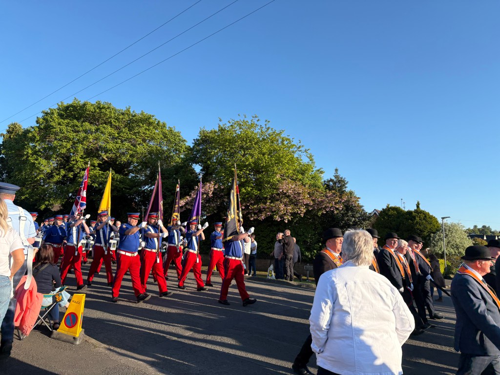My cousin had a bunch of family and friends over to watch the parade celebrating the war being over 80 years ago. Bands and orange lodges came from all over the north.to March in the parade. It came right past my cousins house so we had excellent seats.