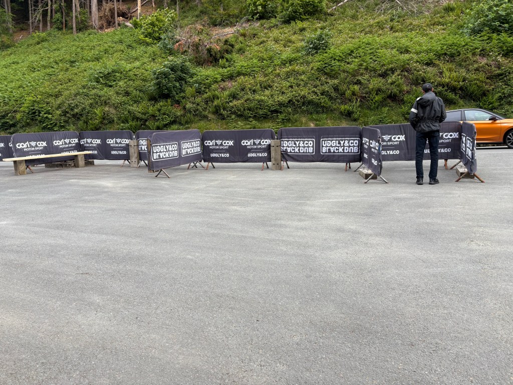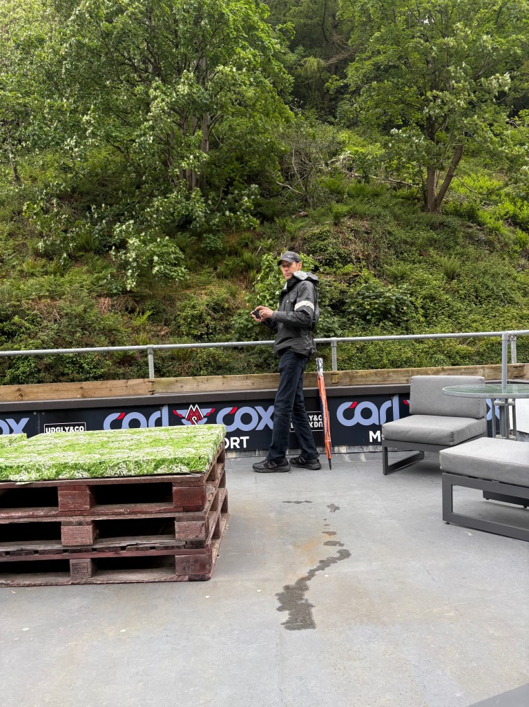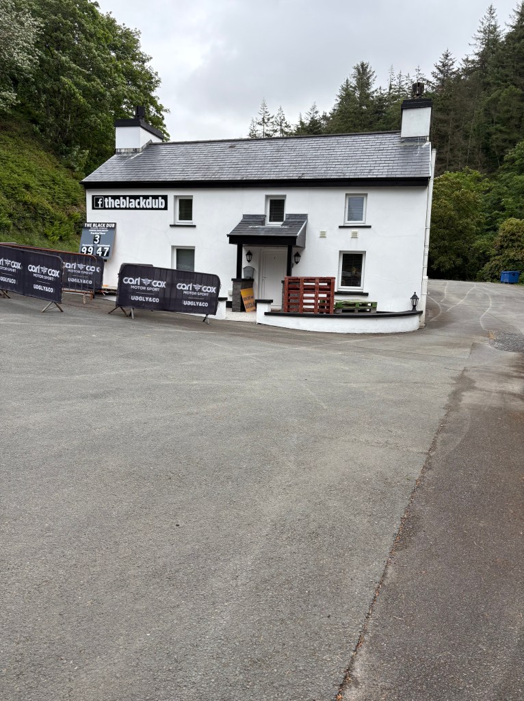 Got up bright and early this morning and headed to the Black Dub Inn to watch the practice races and 1 st qualifiers. We had booked into the VIP section which gave us a phenomenal view of one of the s curves and a big screen tv to watch all the action on the whole track. The staff was amazing, made sure we had everything we needed while we waited. You have to get to your watch destination an hour before the race starts as they close the road then the Marshall walk it looking for any garbage on the road. The first few bikes came through and then several of the side car bikes before the rain started and the day got called.