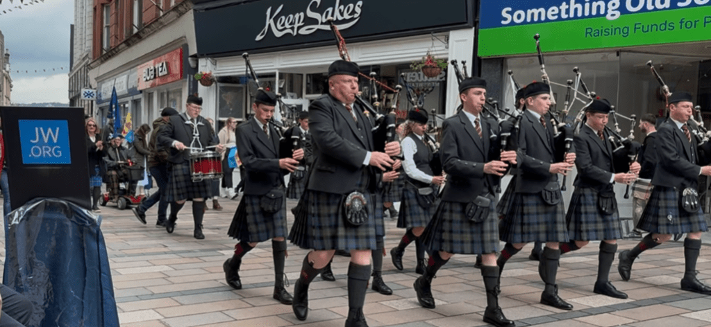 We got to see a small parade through the pedestrian shopping center. I’m not sure what it was in honor of but the beginning of the parade people were dressed in old fashion farming cloths carrying pitch fork, clubs and shovels followed by a pipe band.