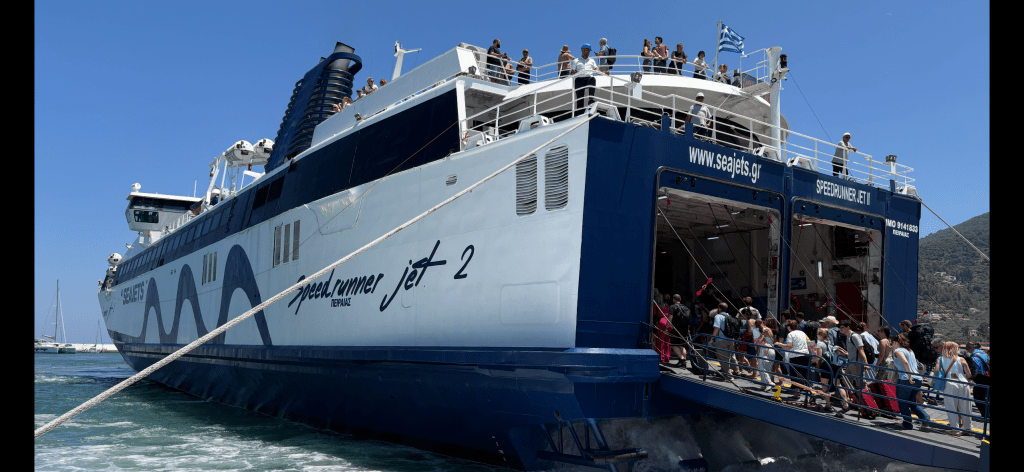The ferry to the island was something else. We all lined up with the cars then the loading ramps came down. All the crew started yelling rushing everyone. You had to go up the ramps, put your luggage on the shelve which didn’t have enough room all while staying out of the way of the cars. The whole time people are trying to make their way to the seating area a very loud alarm is going off as the loading ramps are coming up. The crew keeps yelling for everyone that is still finding room for their bags to move ahead as they are still on the loading ramps. Next you went up stairs to where someone was rushing you to sit down. There were assigned seats but most people just sat anywhere. A few of the ferry workers then tried to get people to move. The ferry ride was under an hour so in about 25 minutes you had to do the same thing in reverse and be standing downstairs with your luggage as they docked the boat. The vehicle were running right beside you so not only were you jammed in this line but breathing gas fumes the whole time. Kind of reminded me of the movies where they need to evacuate earth very quickly.